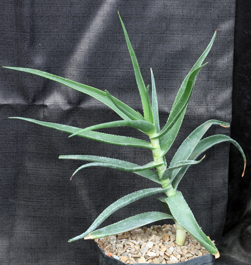 This species, one of the most frost hardy of the Aloaceae, is common on rocky slopes and mountain tops in the Eastern Cape Province of South Africa and Lesotho. The slender branches of young plants, as well as the narrow, nearly linear leaves, belie the fact that the mature plant is a small tree with relatively broad, lancheolate leaves. The flowers are orange to red and held in a relatively short raceme. Our plants had no damage recently at 23F but this species is easily capable of mid-teens for low temperatures. Our plants are rooted cuttings in one-gallon pots.