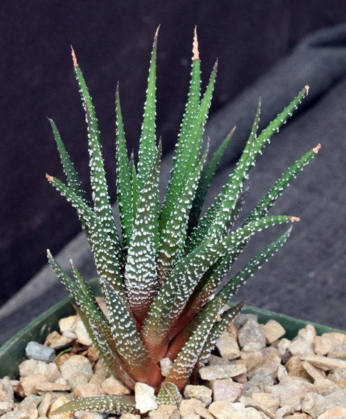In many respects, this is the classic Haworthia, and it defines the subgenus Hexangulares. This species, from the Eastern Cape Province (JDV 90-42), has erect narrow leaves with tiny white raised tubercles. The tubercles are more-or-less randomly arranged on both leaf faces. They are rooted offsets in 5-inch pots.