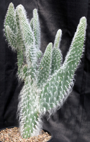 From the northern deserts of Mexico, this plant is somewhat unique and distinctive for its predominant covering of white hairs. The flowers are yellow with reddish highlights. These plants are rooted cuttings in 2-gallon pots.