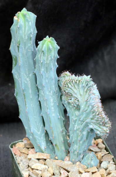 This species is widespread in north-central Mexico with its distribution centered on Tamaulipas. Known in the US as blue Mexican fencepost, this species characteristically has blue-green stems with small black spines. These plants are the cresting version of the typical species and are in various stages of cresting. The flowers are small and greenish-white and are produced in the summer. These plants are rooted cuttings in 4-inch pots.