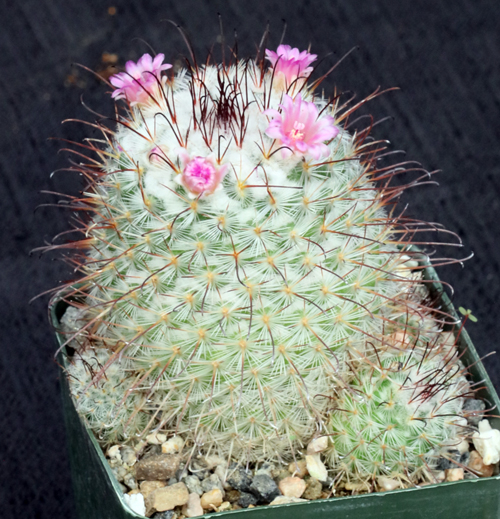 From west-central Mexico, this clump-forming species is well known for its numerous globose stems with wool-covered apices. The flowers are red-violet. These plants are seedlings in 4-inch pots.