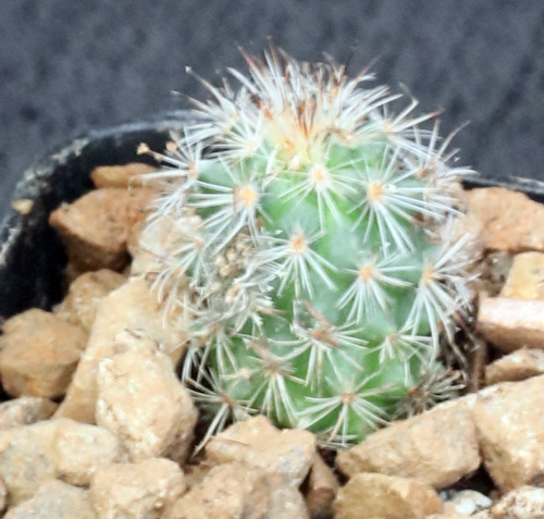 This cylindrical, sparsely offsetting species has a blue-green body with numerous dark spines and white bristles near the tip. It is from Nuevo Leon, Tamaulipas, and San Luis Potosi, Mexico. The flowers are purple and showy. These plants are seedlings in 2-inch pots.