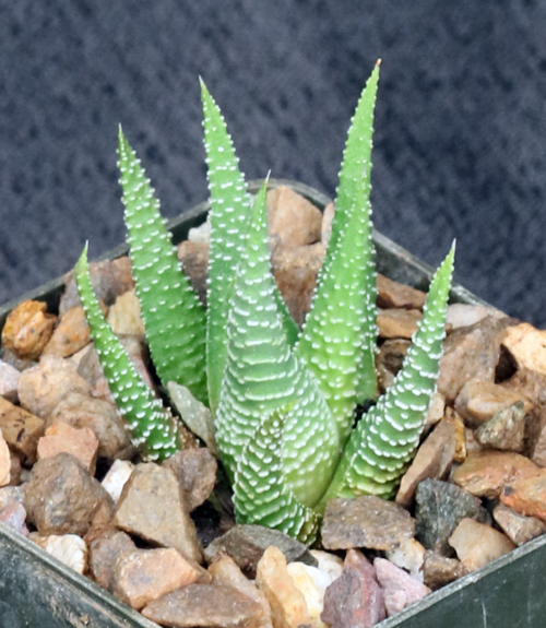 From material originally collected in Heidelberg (GM 309), Western Cape Province of South Africa, H. minima var. minima is a small species related to H. pumila and one that slowly offsets, forming small clumps. It occurs in the winter-rainfall area, but this does not seem to affect its survival in the hot and summer-rainfall Tucson. These plants are seedlings in 3-inch pots.