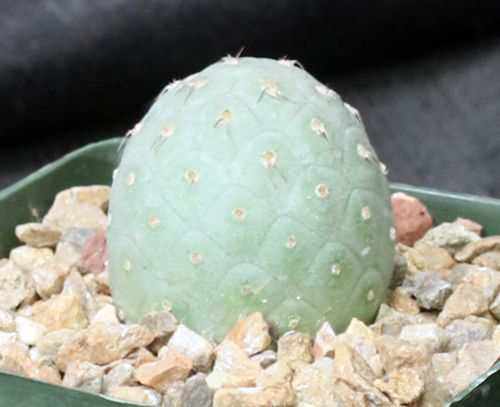 Often known as variety geometrizans, this species is from Argentina. The globose heads are very nearly spherical, have only glochids (nasty things), and are nearly the size of baseballs. The flowers are a brownish yellow. These plants are rooted cuttings in 5-inch pots.