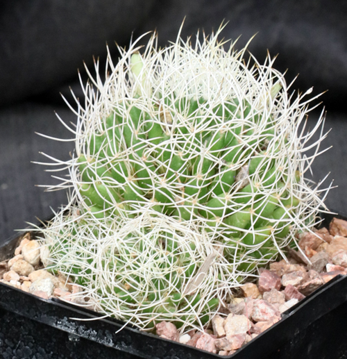From Baja California Sur, and islands in the Sea of Cortez, this is a clumping species with light green stems that are nearly obscured by white spines and wool. The flowers are mostly white with reddish veins and violet centers. These plants are seedlings in 5-inch pots.