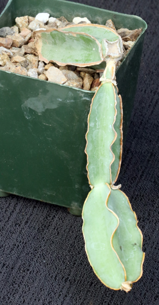 This species, which ranges widely on the eastern side of Africa, is a climbing succulent vine. These plants are propagated from material originally collected from eastern Kenya (WY 1203). Once you see those leaves, you readily put it in the Vitaceae (grape) family. The stems are quadrangular with wavy margins between the nodes. This clone has a blue-green body with pinkish-red wavy margins and the stem is a little more robust than the typical form. We offer rooted cuttings of this species in 4-inch pots.