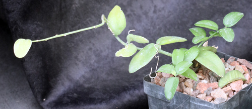 This strange member of the Cucurbitaceae looks like a bunch of green disks hanging off a wire. From western and southwestern Madagascar, it is a scrambling vine. The leaves are small, disk-shaped, and succulent. The glowers are greenish-yellow and are relatively small; the species is dioecious. These plants are rooted cuttings in 4-inch pots.
