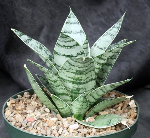 S. trifasciata var. hahnii has the shortest leaves in the S. trifasciata complex. This cultivar has nearly silver leaves with black markings that give it the cultivar name of Silver Star. These plants are rooted offsets in 5-inch pots.