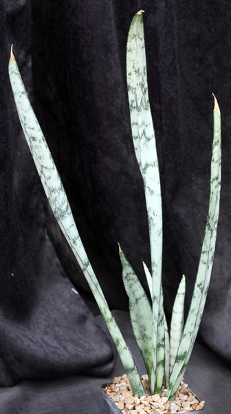 This cultivar of the classic Sansevieria trifasciata is a tall, broad-leafed plant with light yellow-gray leaves. The coloration is somewhat like laurentii cv Silver. These plants are rooted offsets in 5-inch pots.