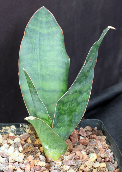 From somewhere in southern Africa, this dwarf broad-leaf Sansevieria has mostly dark green leaves with a faint metallic sheen. Prominent darker banding occurs on the mostly medium green leaves that are slightly rough to the touch. These plants are rooted offsets in one-gallon pots.