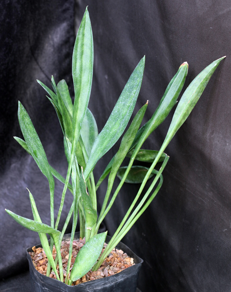 These plants are from material originally collected by John Lavranos (Lav 5933) from Mozambique. This small species loves shade. The plants are relatively small with spathulate leaves on relatively long petioles. The leaves are faintly variegated and tend to fold, particularly when placed in high-light situations. These plants are rooted offsets in one-gallon pots.