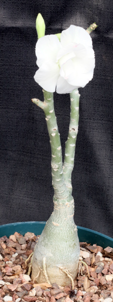 $75 This cultivar was developed in India by a large grower of cultivar Adenium. It has double-white flowers that are smaller than typical A. obesum flowers. These plants are grafted cuttings on Adenium obesum in 8-inch pots.