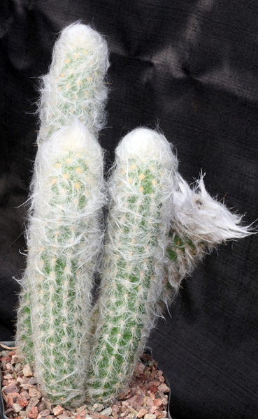 This short, offsetting columnar cactus, which would fall under the broad common name of "Old Man Cactus," comes from Peru. This version, once known as Morawetzia sericata, has the most wool of the various forms of this species, some of which have green stems with only a few yellow spines and little or no wool. These plants are rooted cutting sin one-gallon pots.