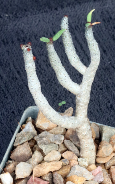 This shrublet is from the greater Richtersveld area of South Africa and southern Namibia, where it typically grows in rocks in the winter-rainfall region. It has little stems that are extremely brittle, and those stems produce light green ovate leaves in little clusters. When larger, the older stems produce shredding back. The flowers are small. These plants are rooted cuttings in 3-inch pots. We expect stem breakage during shipment, but those stems can be rooted.