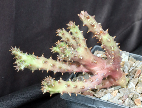 This succulent Asclepiad is from East Africa and Socotra. Possessing one of the most beautiful flowers in this group, this extremely gnarled species typically grows under shrubs but occasionally appears on open ground. When in deep shade, the branches are dark green; when in the open, they can have a whitish-to-purplish cast. One look at the large flower and you will know why you want this plant in your collection. We have rooted cuttings of this species in 5-inch pots.