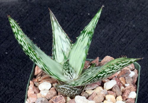 From Somalia, this species is part of a complex that includes A. somalensis, A. harlana, and A. peckii. A. hemmingii sparsely offsets from its small rosettes that bear lancheolate brown-green leaves with near-linear white spots. The inflorescence is relatively short with small pink-red flowers. These plants are rooted offsets in 4-inch pots.