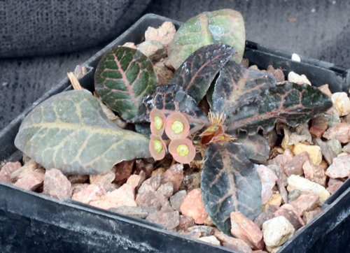 One of the most popular miniatures from Madagascar, this species is part of the Euphorbia decaryi complex. Collectors particularly prize this species for the beautiful mottling on the leaves. Those wavy-margined leaves are dark reddish-green, mottled in silvery gray, pink, light green, and off-white. These plants are rooted cuttings in 5-inch pots.