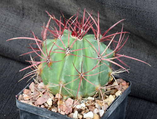 This Ferocactus, from north-central Mexico, is sometimes referred to as Ferocactus pilosus and has the reputation of being one of the most spectacular of the genus. These densely spined cacti are known for their red-orange flowers that typically are produced in the summer. The spines are reddish-brown, the body is dark green, and the plants can reach 10-feet tall. These plants are seedlings in 5-inch pots.