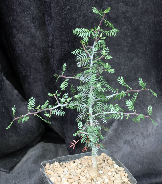 A native of Arizona and California, and extending southwards into Sonora and Baja California, this species of the genus Bursera develops a thick trunk with light gray-brown bark and finely pinnate leaves. This form is the one that grows on the south side of South Mountain south of Phoenix, Arizona. We grow this species outside in Tucson, where it withstands 25F; heavier frost actually sculpts the plants into a nicer, more compact form. Our seedlings are in one-gallon pots.