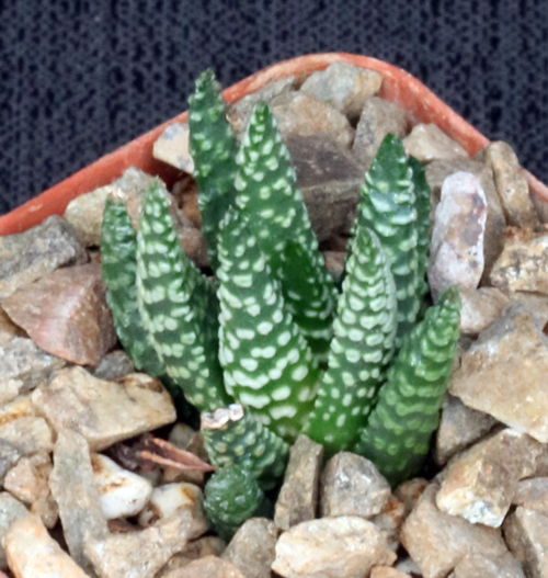 This variant of Haworthia pumila has doughnut-shaped tubercles on the leaves. The rosettes are fairly tight but the plants are robust, forming very nice individuals. These plants are seedlings in 3-inch pots.