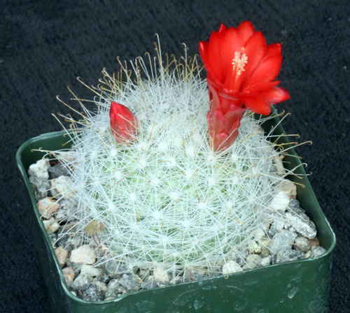This species occurs in the western Chihuahuan Desert ofMexico. As the name suggests, the body of this clustering plant is covered with long white spines, obscuring its light-green body. The flowers are small and dark red, suggesting a relationship with the genus Cochemiea. These plants are seedlings in 4-inch pots.