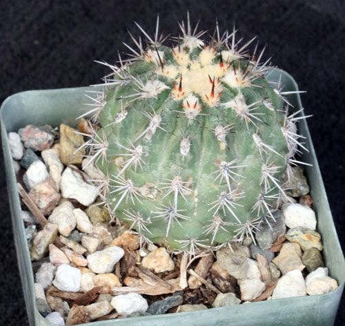This species is from southwestern Peru in the Andes Mountains. It has a medium green globose body covered with light yellow spines, and it tends to be solitary. The flowers are pink to red. These plants are seedlings in 4-inch pots.