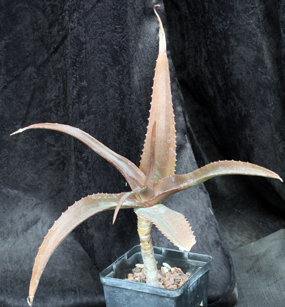 This beautiful tree Aloe is from Madagascar. The leaves are recurved downward and have a glossy green bronze color. The flowers are small, numerous, and red, and in our experience these plants flower at a height of about 3 feet. These plants take significant frost damage at 20F. These plants are seedlings in 5-inch pots.
