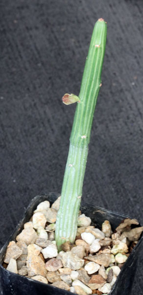 This species, from Somalia, has slender, dark green finely grooved stems. The leaves usually are inconspicuous, and the flowers are yellow. This is a brittle-stemmed species, and the broken parts are easily rooted. We have rooted cuttings in 2-inch pots.