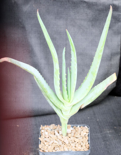 This light-blue green Aloe is found in cliff habitats in Mpumalanga Province of South Africa. Because of its cremnophilous nature, it wants to hang from pots, curving upwards towards the light. The flowers are light red. This species has taken 18F with moderate leaf damage in Tucson. These plants are rooted offsets in 5-inch pots.