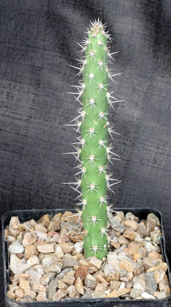 This species is one of those plants that is taxonomically confused in the cactus family. It is a scrambling cactus with round, ribbed stems and numerous white spines. The flowers are large, white, and open at night. These plants are rooted cuttings in 4-inch pots.