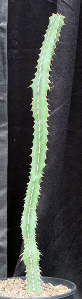 From Namibia, this species tends to grow on rocky slopes, forming shrubs that branch from the base. The branches are usually 6-angled and blue-grey, and the spines occur on a contiguous horny margin. We grow this species outside in Tucson, where it has been undamaged at 20F with full sky exposure. These plants are rooted cuttings in 2-gallon pots.