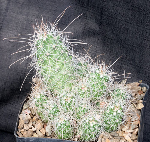 Although some consider this to be part of the genus Mammillaria, we keep it separate, in large part because of the large, red tubular flowers with irregular lips. This species is endemic to Baja California, where it occurs mostly south in Baja California Sur. Known for forming large clumps with relatively short stems, this species is both attractive and highly resistant to frost. Our plants were undamaged at 15F. These plants are seedlings in one-gallon pots.