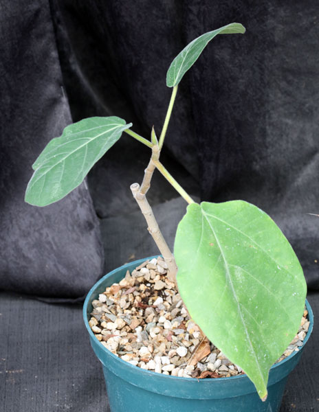 This species occurs in Ethiopia and Yemen. It is a large tree with smooth bark and rather large green leaves that are entire with whitish veins but otherwise unimpressive. These plants are rooted cuttings in 8-inch pots.