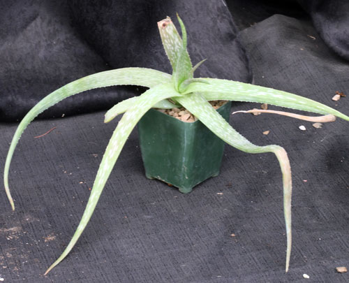 From Tanzania and extending into Zambia, this cliff-dwelling species is a short shrub or tree. It has yellow-green leaves that are narrow and falcate. The flowers are light yellow. These plants are seedlings in 4-inch pots.