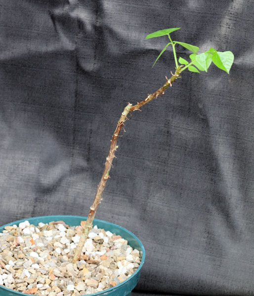 In coastal settings of South Africa, ranging northeastwards from the Eastern Cape Province to KwaZulu-Natal, this large tree has bright scarlet flowers. The dark-green leaves are palmate and have little protuberances that resemble thorns. These plants are seedlings in 8-inch pots.