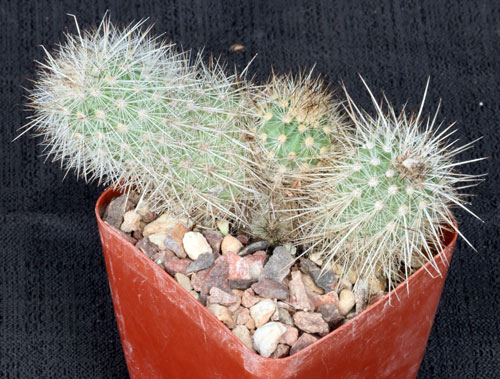This monospecific genus occurs in the foothills of the Andes in Peru. Mila caespitosa is highly variable and shows affinity to the North America Echinocereus. It is a low-growing clumping species with a green bod and numerous gray-green spines from whitish aureoles. The flowers are golden yellow with reddish tepals. These plants are seedlings in 4-inch pots.