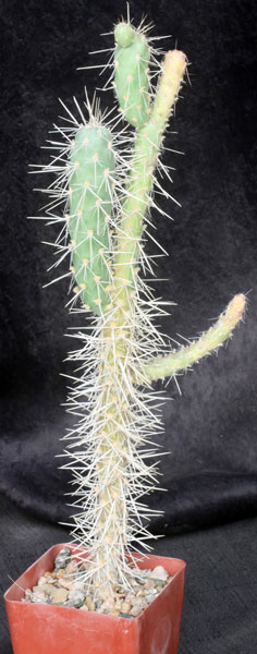 From the Colorado Desert of California (Baker 18469), extending southwards into northeastern Baja California, this is a shrubby cholla that is rather unkempt looking. Its dominantly yellow color comes from the numerous spines arising from narrow stems. The flowers are reddish-brown. These plants are rooted cuttings in 4-inch pots.