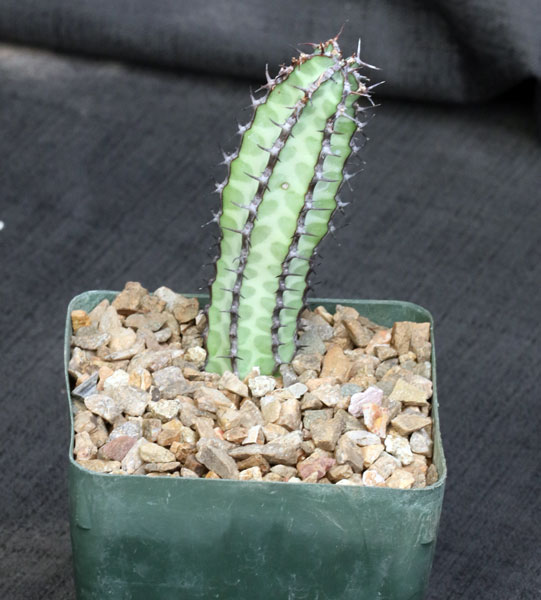 From northeastern Uganda, northern Kenya, and southern Ethiopia, this shrubby Euphorbia produces numerous stems. The thick, variegated stems have stout paired spines, and the species resembles E. heterochroma on steroids. Ya gotta admit this one is a beautiful species. We offer rooted cuttings of this species in 5-inch pots.