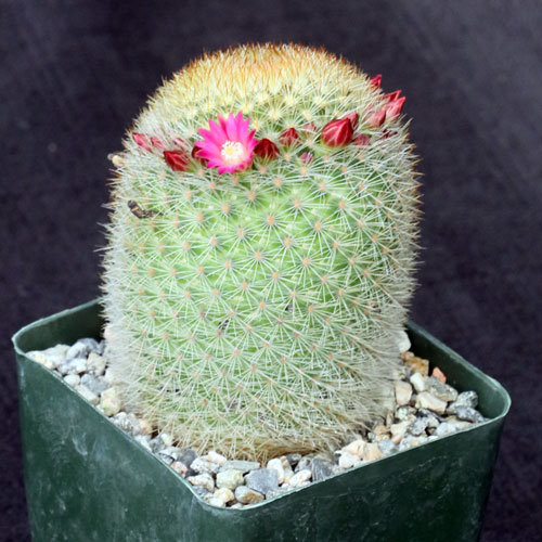 This is considered by some to be a subspecies of Mammillaria spinosissima, but these plants do not resemble each other in our experience. From an area of Guerrero, Mexico, Mammillaria pilcayensis has nearly felt like gray-yellow spines that nearly obscure a green body. This is a columnar type species with longish stems that may be upright or prostrate. The flowers are magenta to violet. These plants are seedlings in 4-inch pots.