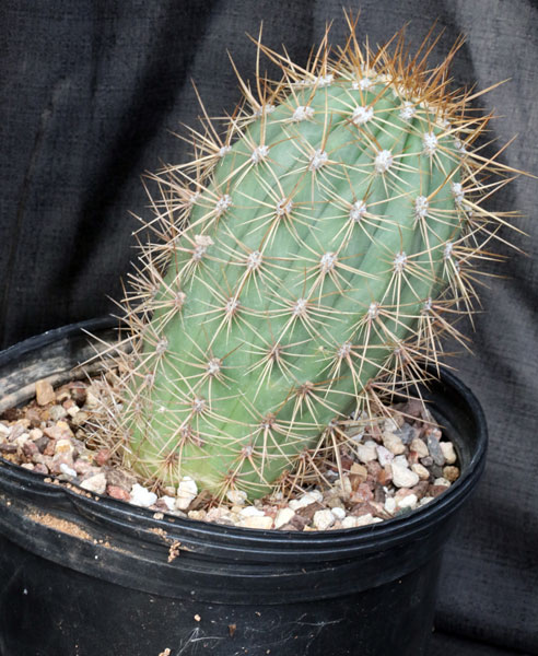This large tree-like cactus is from Bolivia and Peru, and some call this Echinopsis atacamensis. Regardless of whose taxonomy you accept, these plants are large and slow-growing with dark green stems, 6-8 ribs, and many yellow spines. Should you grow it long enough, it will produce large reddish-white flowers. These plants are seedlings in 2-gallon pots.