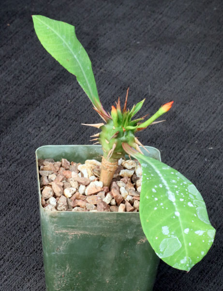 From northern Madagascar, Euphorbia viguieri is a highly variable group. E. viguieri var. viguieri is a single-stemmed species with ovate, bright green leaves and a stem with long, stiff, and dense stipules. Some plants have red markings at the base of the leaves, but this is not consistent among the plants. The flowers are a stunning red and held on a fairly short peduncle. These are seedlings in 4-inch pots.