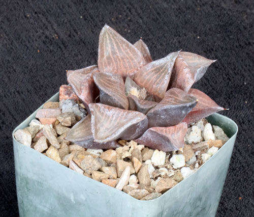 Evidently these plants could be a cross between Haworthia mutica and H. emelyae var. comptoniana. These plants don’t seem to offset, at least not quickly, and have a pink cast over the mostly dark green leaves with no windows. These plants are seedlings in 4-inch pots.
