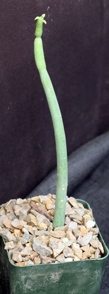 This species, B&L 719, is from the Bari Region of northeastern Somalia. With its upright succulent stems, this species forms small shrubs with yellow cyathia near the tips. These plants are rooted cuttings in 4-inch pots.