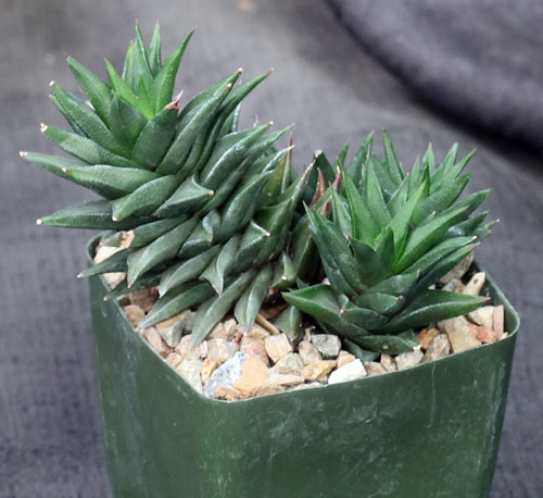 This cultivar is the reverted form of a highly sought-after variegate from Japan. As with other cultivars of this sort, the plain green version can throw the sought-after sports that are yellow-green. We’re holding our breath to see when/if this happens. These plants are rooted offsets in 4-inch pots.