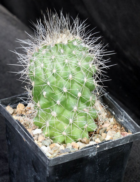 From coastal Chile, where it has a relatively wide distribution in the Atacama Desert, this species has gray, globose stems with black spines. This form clumps, eventually forming nice mounds of numerous stems. The flowers are yellow. We grow this species outside in Tucson, where plants recently experienced 18F and snowfall and were undamaged. These plants are seedlings in 5-inch pots.