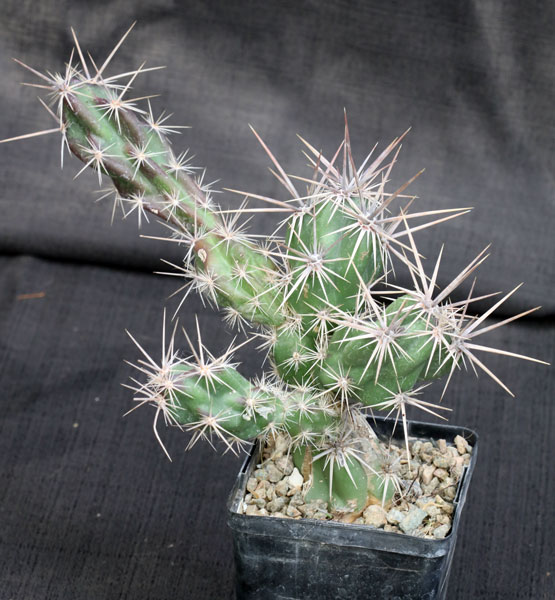This species is endemic to Baja California, Mexico, where it generally occurs in alluvial plains. The club-like joints on this species are covered with fierce, flattened central spines and numerous lateral spines and glochids. The flowers are yellow-green. We grow this species outside in Tucson, where it has been undamaged at 15F. These plants are rooted cuttings in 5-inch pots.