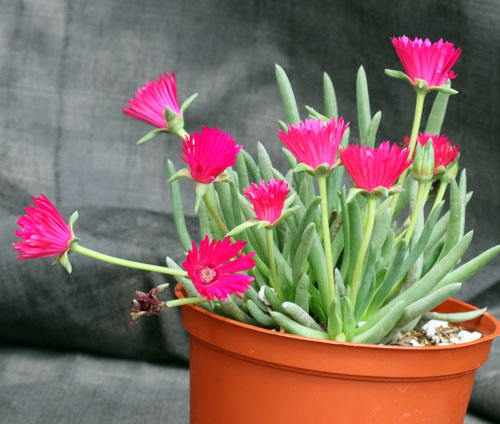 This is a ground-covering mesemb from the Western Cape Province of South Africa. It has long gray-green leaves that usually are upright and no wider than a pencil. The flowers are bright reddish-purple. These plants are seedlings in 6-inch pots.