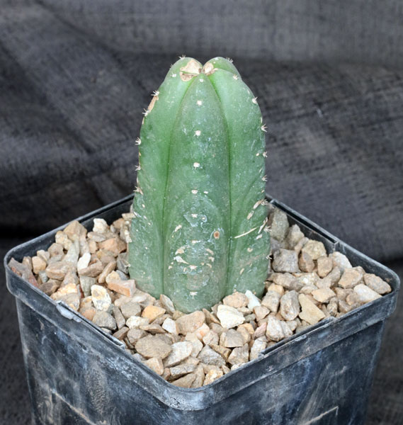 This species, from a small area of Bolivia, strongly resembles Trichocereus pachanoi. Its larger diameter stems, however, and typical spineless nature suggest its place as a separate species. As with many Trichocereus, the flowers are large and predominantly white. These plants are rooted cuttings in 5-inch pots.