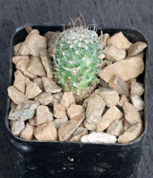 From southern Baja California, Mexico, this is species has clustering, globular stems, a typically light-green body, and mostly dark brown spines. The flowers are large and whitish-pink with darker mid-veins. These plants are seedlings in 2-inch pots.
