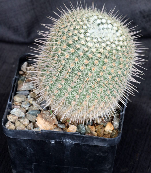 This small globose species is from Uruguay and Brazil, and some consider this to be a subspecies of Parodia mueller-melchersii. It is a solitary species with a medium green body covered with yellowish-brown spines. The flowers are yellow to reddish. These plants are seedlings in 5-inch pots.